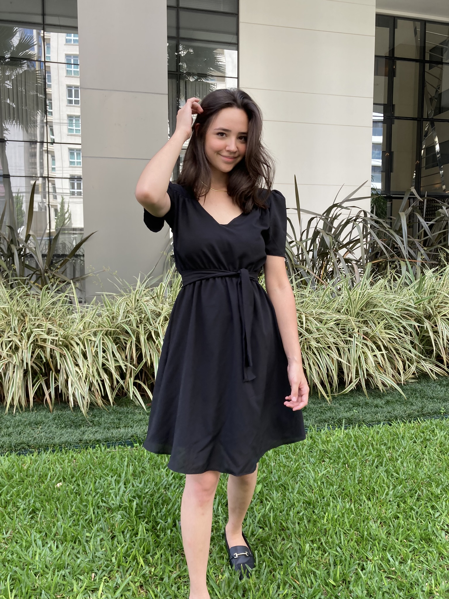 Vestido basic preto possui decote V, mangas bufantes, elastico na cintura e faixa para amaração.